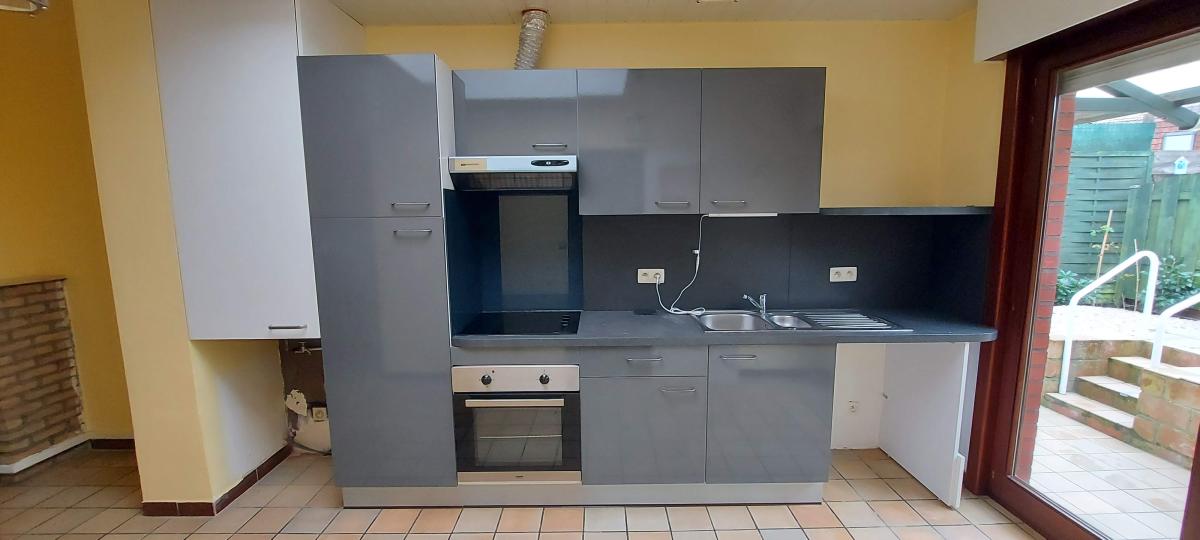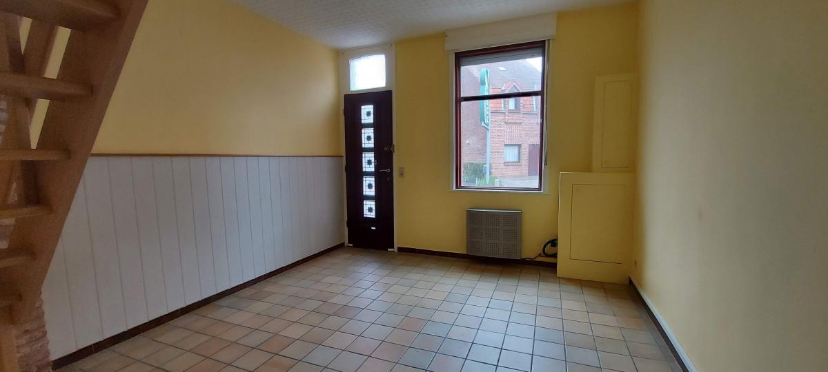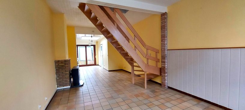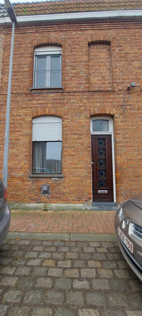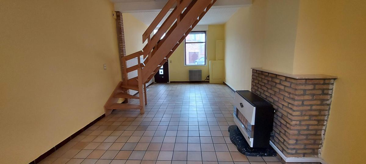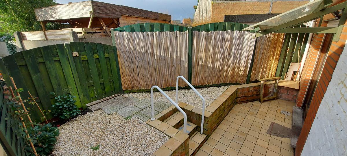 Maison avec place de parking comprenant un living, cuisine équipée, salle de douche, WC, 2 chambres (maintenant parquet au sol), grenier isolé et cour avec jardinet.