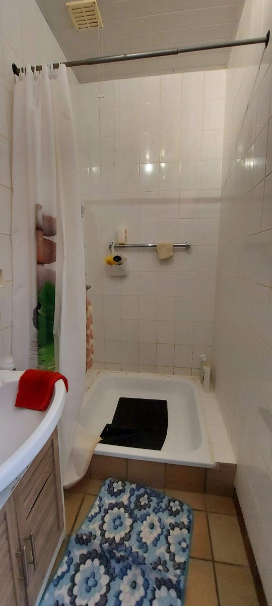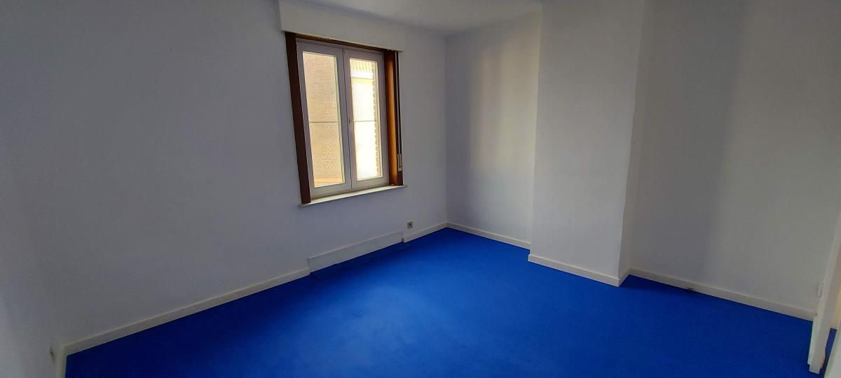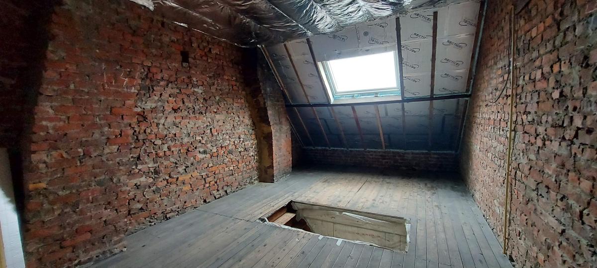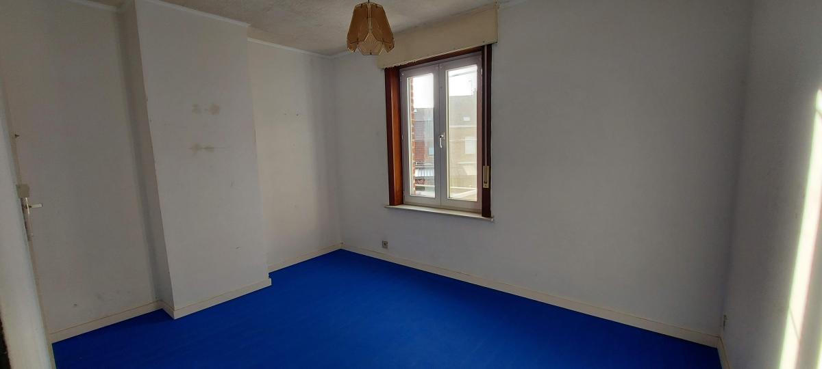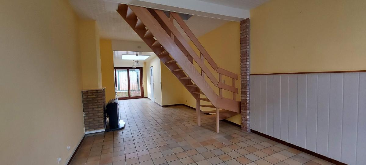 Maison avec place de parking comprenant un living, cuisine équipée, salle de douche, WC, 2 chambres (maintenant parquet au sol), grenier isolé et cour avec jardinet.